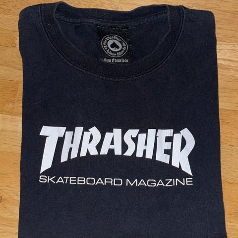 Thrasher Magazine T-skjorte i svart farge. Produktet har logo med flammeeffekt på brystet. Merkeetiketten viser tekst og symboler knyttet til skatekultur og San Francisco. For 13-14 åringer