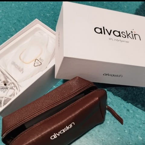 Ny Alvaskin Eplux epilator for ansiktet i hvit farge. Enheten er designet for hårfjerning i ansiktet og leveres med tilbehør inkludert ladekabel og oppbevaringspose.