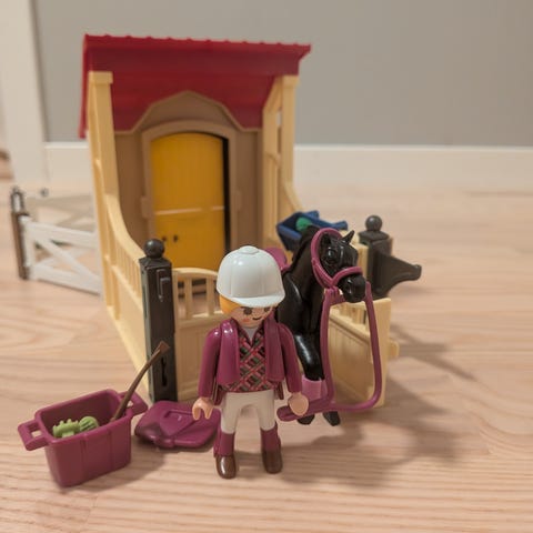 Playmobil hestestall, inkludert tilbehør som dyr og figurer. Lekeplassen har gjerde rundt, flere rom og detaljer som vinduer og dører. Passer for barn som liker rollespill og dyr.