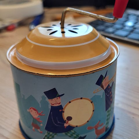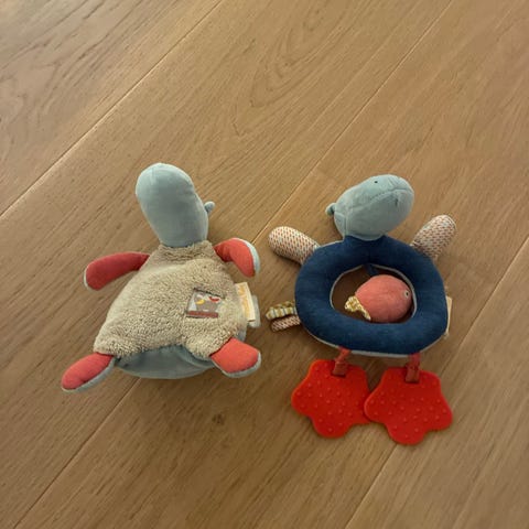Søt spilledåse fra Moulin Roty med fine figurer som snurrer rundt når den spiller. Har blitt lekt masse med, så noen merker.