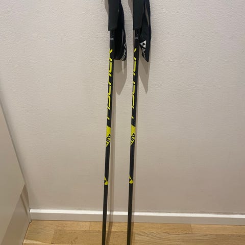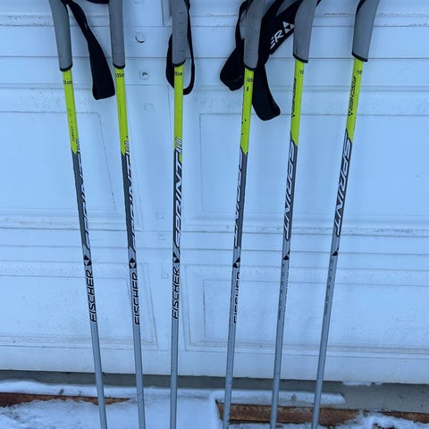 Pent brukte skistaver til barn og junior, Fischer. Lengde 105 cm. Farge svart og gull.