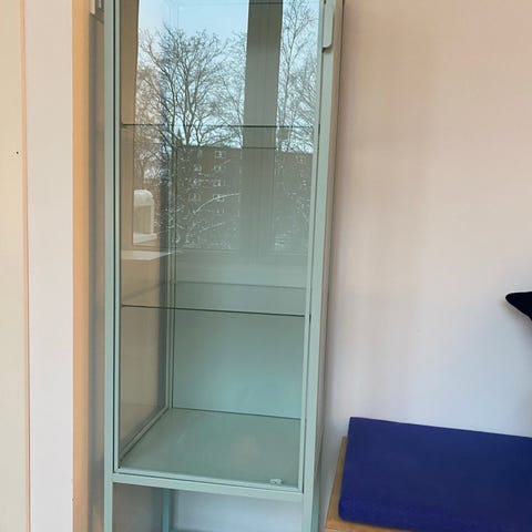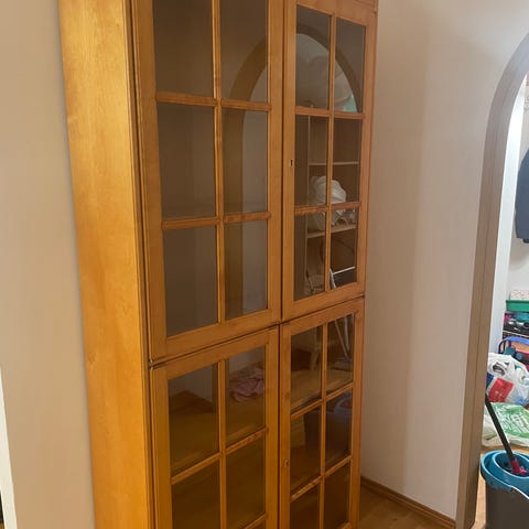 Skap med skyvedører i glass selges pga flytt. Belysning medfølger. Noen deler av belysningen fester ikke lengre/ trenger fikses. Hentes i leilighet.