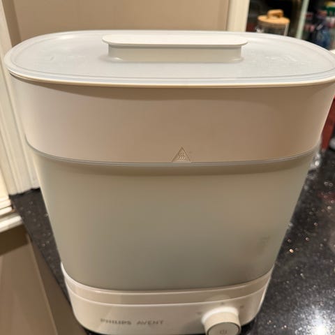Pent brukt flaskesterilisator fra Philips. Kun brukt til et barn. Noe brent i bunnen der vannet koker, men dette er vanlig ved bruk. Fungerer utmerket og etterlater smokker, flasker og utstyr sterilisert.