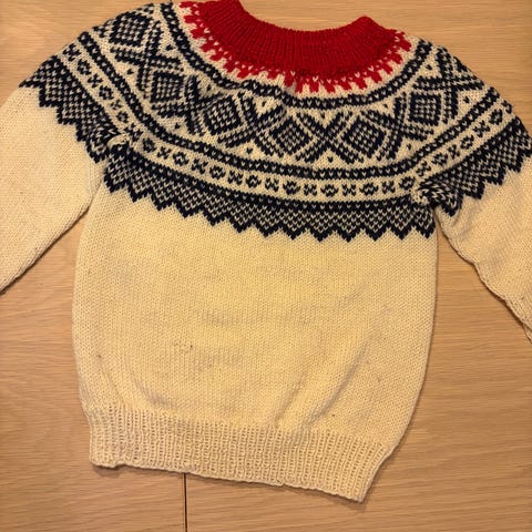 Pent brukt hjemmestrikket Marius ullgenser i str. 92 selges for 150,-.