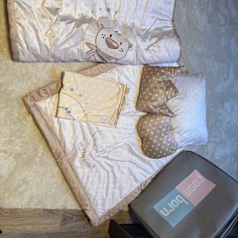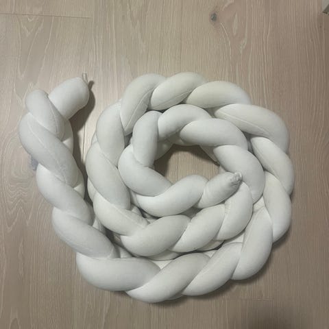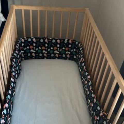 Pent brukt sengekant fra IKEA til standard sprinkelseng. Hvit med grå stjerner. Festes med med borrelås til sprinklene. Meget praktisk hvis man har en smokkebruker da smokkene ikke faller like fort ut av sengen😅 Vi ha også brukt den i standard reiseseng.