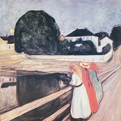 Selger et pent innrammet kunsttrykk etter Edvard Munchs kjente motiv «Pikene på broen».