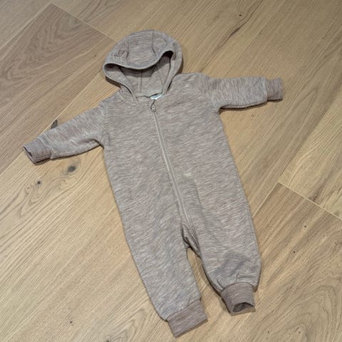 Polarn O. Pyret babydress i størrelse 62, farge grå, designet for unisex bruk. Plagget har hette og glidelås, og er egnet for små barn i alderen 2-6 måneder. Pent brukt.