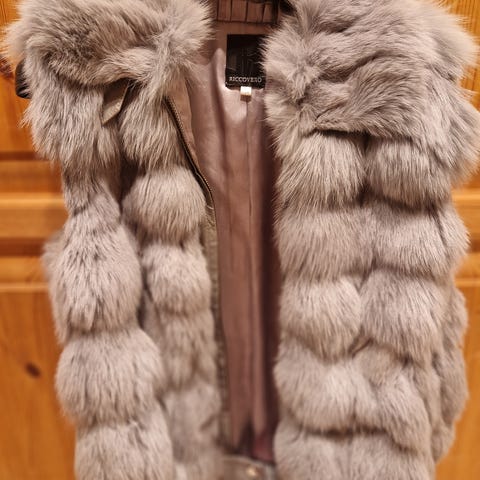 Jakke i semska skinn med pelsdetaljer framme på skuldrane og lommane.