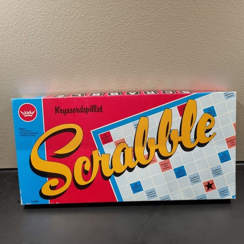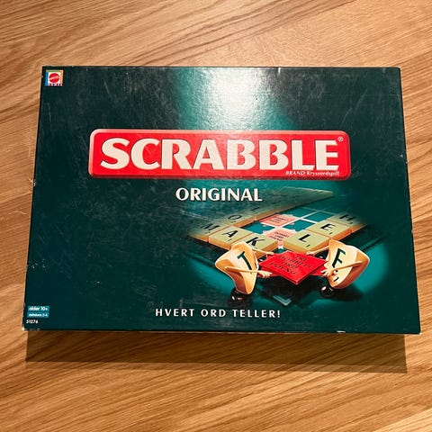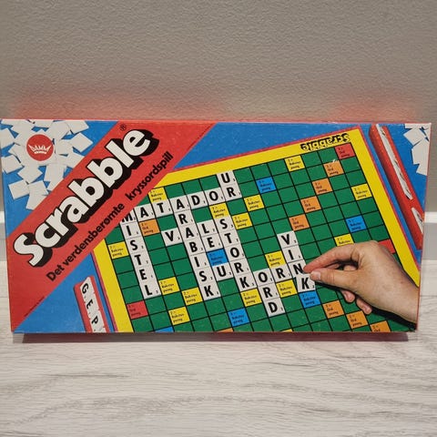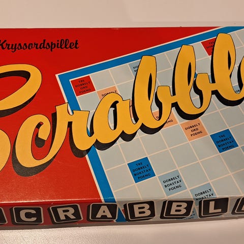 Dam Scrabble Familiespillet brettspill med brett og bokstavbrikker. Spill for flere spillere, egnet for familiebruk. Brettspillet inkluderer spillbrett og bokstavbrikker i eske.