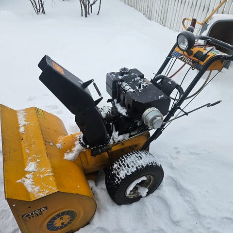 Stiga Snow King selges som den er. Starter lett, men mangler et deksel rundt forgasser og trenger nok noe justering.