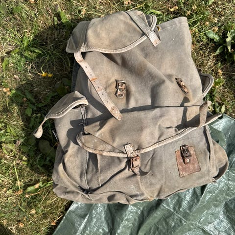 Jaktsekk laget av Nils Lennart Westin, Bjästa, Sverige. Håndsydd i garvet kalveskinn, treramme i bjørk og lokk kledd med saueskinn innvendig. Lokket kan legges over stolen som et sitteunderlag. Sittehøyde ca. 46 cm. Etikett merket 890320 Lennart Westin.