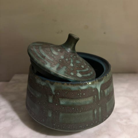 Nydelig krukke med lokk utført av keramiker Karen Erland. Den fremstår uten bruksmerker.