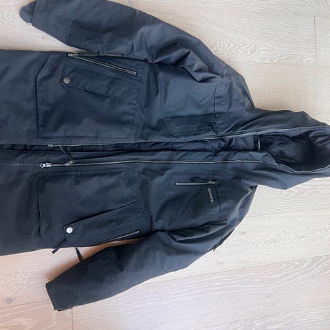 Varm og god parkas i str Large. Fargen er caviar. Mørk grå/svart. Med gore-tex værbeskyttelse, er man både tørr og varm uansett vær. Lommene er foret med fleece og er supervarme!