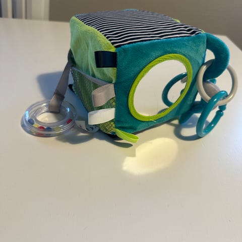 Aktivitetspute til baby. Fin til å hjelpe baby med magetid. En knapp foran i puten utløser lyder (typ fuglekvitter ol.) og vibrasjon i puten. Leken foran er lett å nå for baby når den ligger oppå puten. Kan byttes ut med andre leker og. Kan lett vaskes på finvask i maskinen, for er en lomme for å ta ut lydboksen.