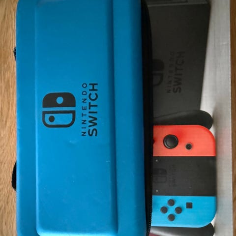 Nintendo Switch spillkonsoll med tilbehør inkludert ladekabel, Joy-Con kontrollere og dock for TV-tilkobling. Konsollen har en berøringsskjerm og kan brukes både som håndholdt enhet og tilkoblet TV. Noen vanlige bruksmerker, som man må regne med.