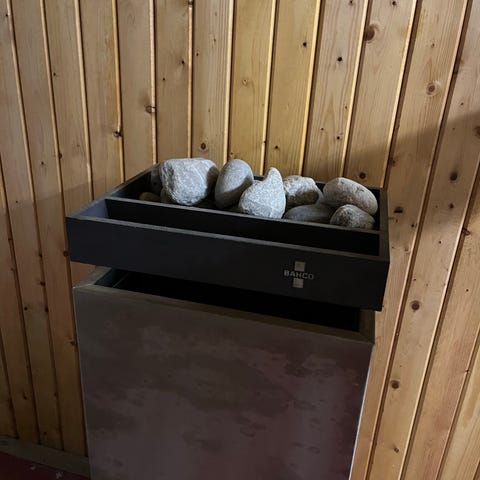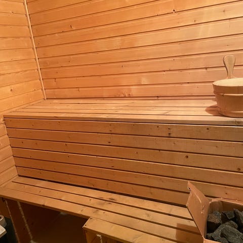 Kube badstue av thermotre i lengde 4m, bredde 2,1m og høyde 2,1m. Utstyrt med vedfyrt ovn 15kw og 40 kg stein, med beskyttelse på vegg og gulv.