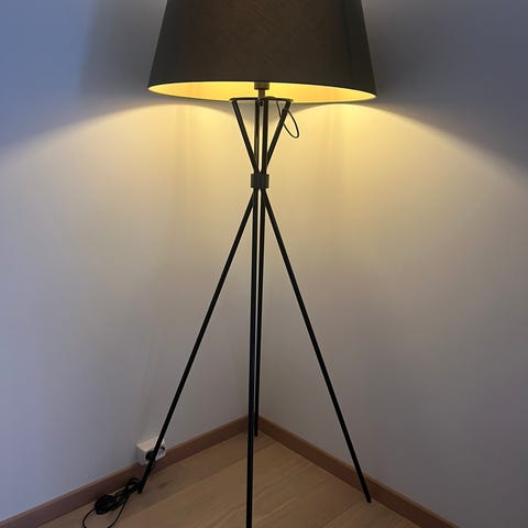 Gulvlampe fra Bolia i hvit og krom. Buet med solid/ tung fot. Foten er hvit. Lengden kan justeres og «foten» kan lett plasseres under f eks sofa da den kun er 5 cm høy. Diameter for lampeskjerm er ca 27 cm, diameter for lampefot er ca 40 cm. Lengden på armen kan justeres. Solid og pen lampe. Ingen bruksmerker. Demonteres i tre deler. Må hentes!