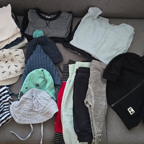 12 pysjer, 6 ullbody, 1 ulldress, 1 ullgenser, 7 sokker/ tøfler, 5 luer 1 smekke