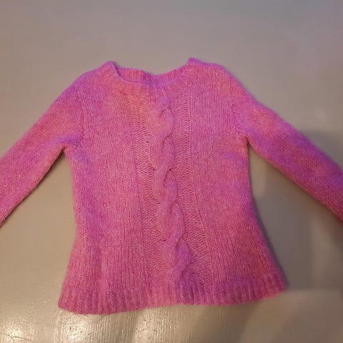 Helt ny. Strikket hjertegenser til jente. Kjempefin rødfarge. 100% ull. Ikke brukt da jeg strikket feil str. Passer jente 4-5 år