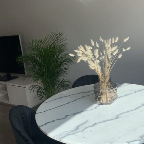 Spisebord med 3 innleggsplater og 6 stoler.