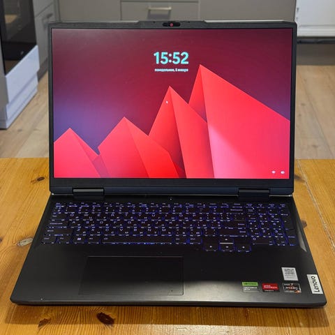 Lenovo bærbar PC i svart farge. Produktet har standard tastatur og flere porter på siden. Designet for gaming med et robust chassis.