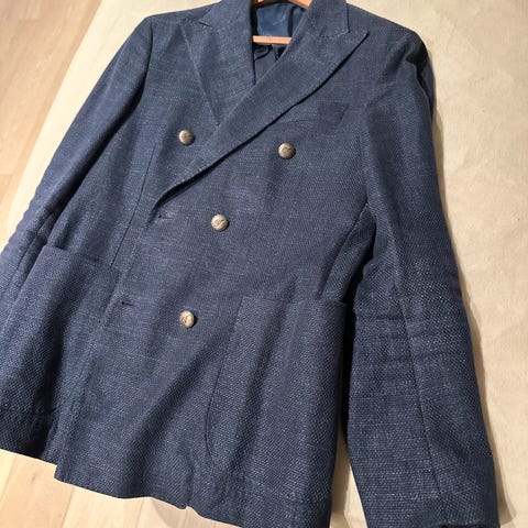 Blazer i størrelse 46 for herre, med tweed/ull design i grå farge. Jakken har to knapper foran og er foret med et mønstret fôr. Den har klassisk design med slag og lommer foran.