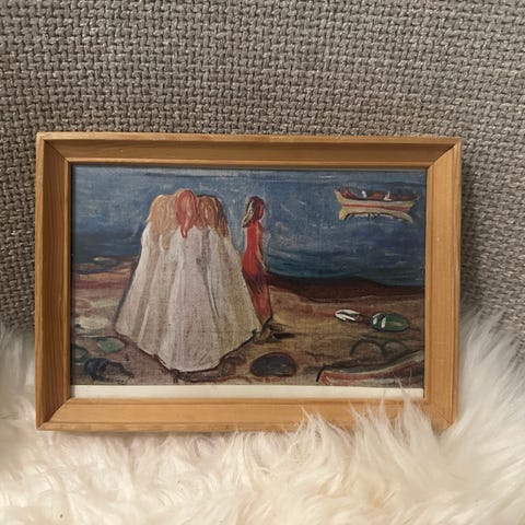 Edvard Munchs ikoniske motiv "Pikene på broen" fra Åsgårdstrand. Innrammet og med passepartout og klart til å henges opp.