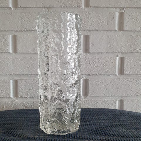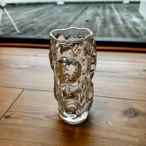 Vasen er av klart, tykt pressglass med tydelig preget/abstrakt relieff. Ca. 20,5 cm høy.