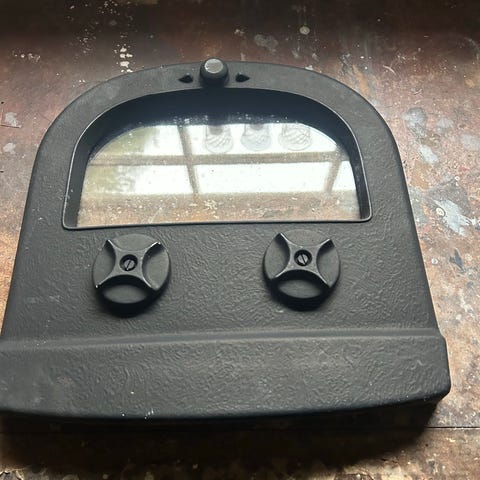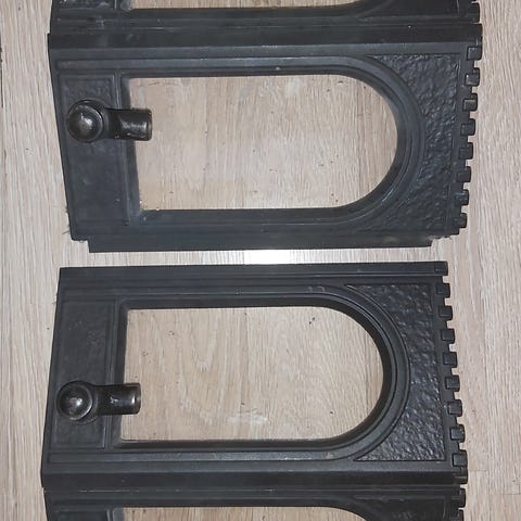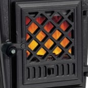 Glassdør til Jøtul vedovn F602 som er laget i støpejern med et rutemønster. Døren har en svart finish og inkluderer en håndtaksmekanisme for åpning og lukking.