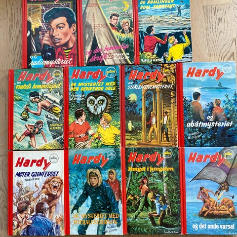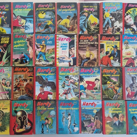 Liker du Hardyguttene? Dette er sjansen din, til å få tak i de gamle klassikerne. 58 bøker, nummerert fra 1 til 70, med unntak av nr. 6,7,8,10,11,12,13,17,43,44,51 og 53. Falmete rygger på nr. 2,5,14,15,18,21,24,32,33,35,42,48,54 og 56. Selges samlet.