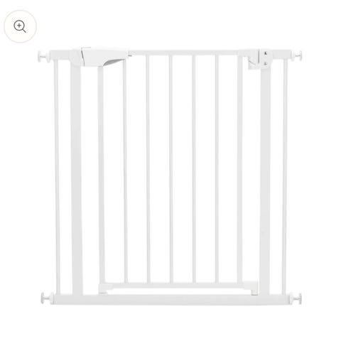 Safety 1st Auto Close barnegrind med U-Pressure Fit-system, passer åpninger fra 73 cm til 80 cm, med mulighet for forlengelse opptil 136 cm. Fargen er hvit, og produktet er laget for å sikre barn i hjemmet ved å hindre tilgang til trapper eller andre områder.