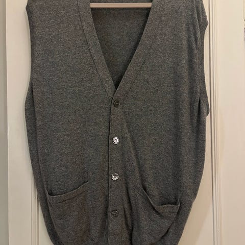 Deilig og myk lyse grå vest i kasjmirull. Den er av merket John Laing, kjent for å lage luksus kasjmir klær i Skottland. Vesten har to lommer foran og er i god stand.