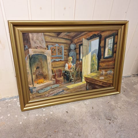 T. Bork Jensen oljemaleri som avbilder et landskap med fjell, vann og hytter. Maleriet er innrammet og viser detaljerte naturmotiver med fjelltopper, trær og refleksjoner i vannet.