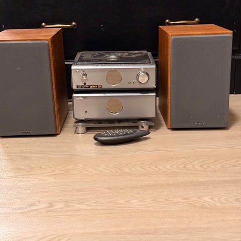 Hitachi stereopakke med CD-spiller, kassettspiller og radio tuner. Inkluderer fjernkontroll og to høyttalere. Passer til avspilling av musikk fra CD, kassett og radio.