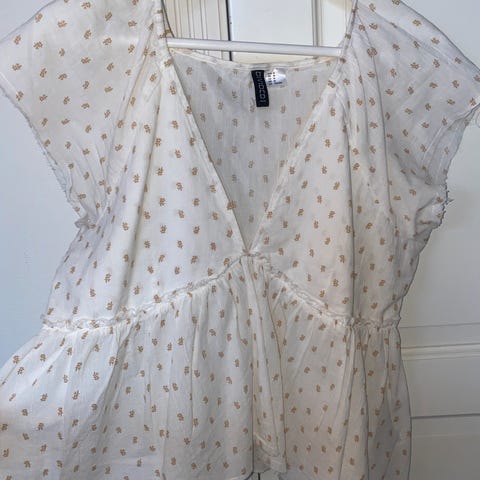 Farge: Hvit/krem med blått/svart blomstertrykk.
