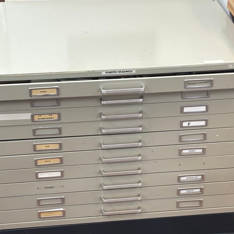 Skuff-frontene brettes ned for lett tilgang, se bilder. Egnet for størrelse A1 (59 cm x 84 cm ) og mindre. Produsert av Høvik Stål, ukjent alder. Var en gang eid av Norsk filminstitutt.