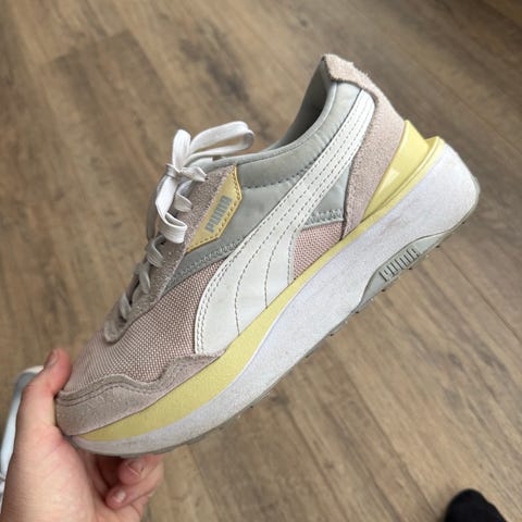 Puma Sneakers joggesko i størrelse 38, et par i svart farge og et i beige. Skoene har en hvit såle og er laget med materialer som gir komfort og støtte for daglig bruk.