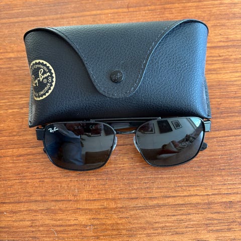 Ray-Ban solbriller for unisex. Brillene har en svart innfatning og mørke glass. Kommer med etuiet vist på bildet. Brukt kun ett par ganger😎