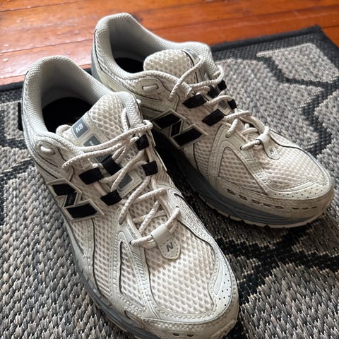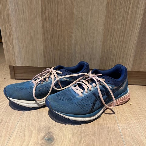 Modell løpesko i størrelse 38, designet for løping. Skoene har en kombinasjon av grønt, hvitt og gult fargevalg, og er laget med materialer som gir støtte og komfort under løpeaktiviteter.