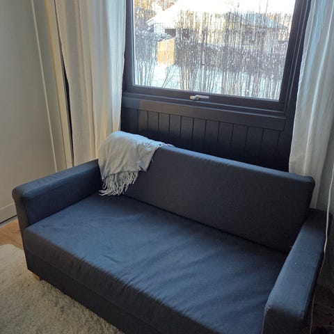 Sofaen er noe ødelagt/kosmetisk skadet og noen bruksmerker. men fungerer som den skal både som sofa og seng.