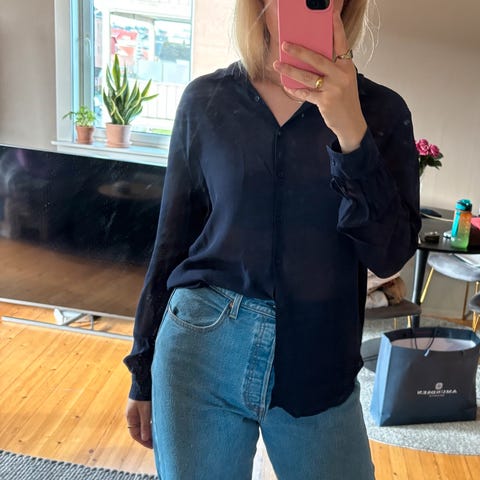 SAND Copenhagen Bluse i denimmateriale, størrelse 40, farge blå. Blusen har rund hals og knappelukking foran.