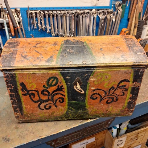 Kisten er gammel og velbrukt, men i god stand.