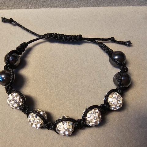 Dette ligner et Shamballa-armbånd, en populær stil av makramé-armbånd som er justerbart. Armbåndet er knyttet med en svart snor og har en rekke perler: