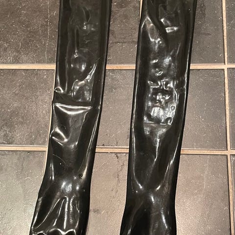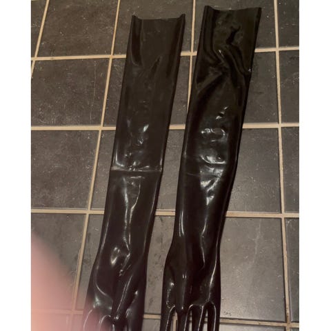Jeg selger et par lange latex hansker til dame i størrelse small. Nesten nye