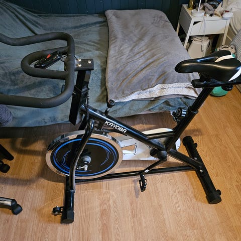 Duamant Photon spinningsykkel i hvit farge. Utstyrt med justerbart sete og styre for tilpasning til bruker. Designet for innendørs trening.