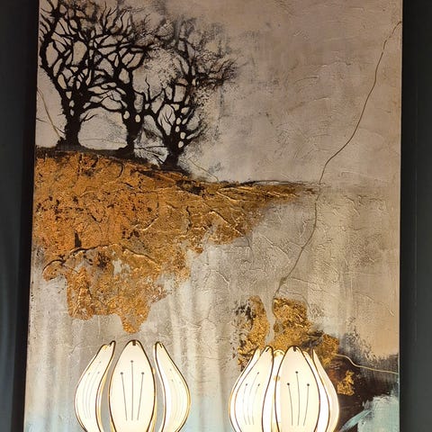 Selger en helt nydelig, stor, Lotus taklampe i hvit, frostet glass og messing, metall. 8 stk. glass panel er dekorert med gull detaljer. Lampe er formet som en blomst med korte og lange blader. Denne kan du ha i stua, soverommet, gangen, hytta og overalt ellers. Lite bruksmerker for alder. Sjekket og virker som den skal. Ingen skader. Kort kjetting, men dette er å få kjøpt flere steder. Stor pæresokkel. Sego armaturen, Sverige.