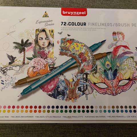 Det er 12 tusjer totalt. Jeg har brukt dem veldig lite – de står stort sett ubrukt. To av markørene er helt nye, fortsatt forseglet i folie. Noen av de andre kan være litt tørre, men de kan enkelt etterfylles, så de er fullt brukbare.