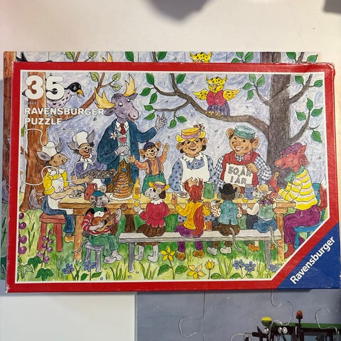 Flere trepuslespill for barn med knopper i forskjellige former og motiver, inkludert kjøretøy, dyr og figurer. Puslespillene har fargerike illustrasjoner og er laget av tre. Passer for små barn for å utvikle motoriske ferdigheter og gjenkjennelse av former og objekter.