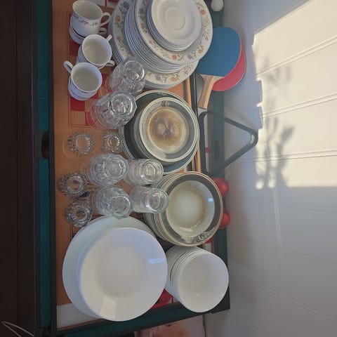Middagstallerkener, suppetallerkener, skåler, kaffekopper med skål, kaffekrus.