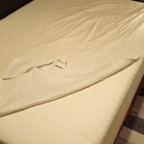 Rammemadrassen er synlig brukt. Det har blitt sølt kaffe eller lignende